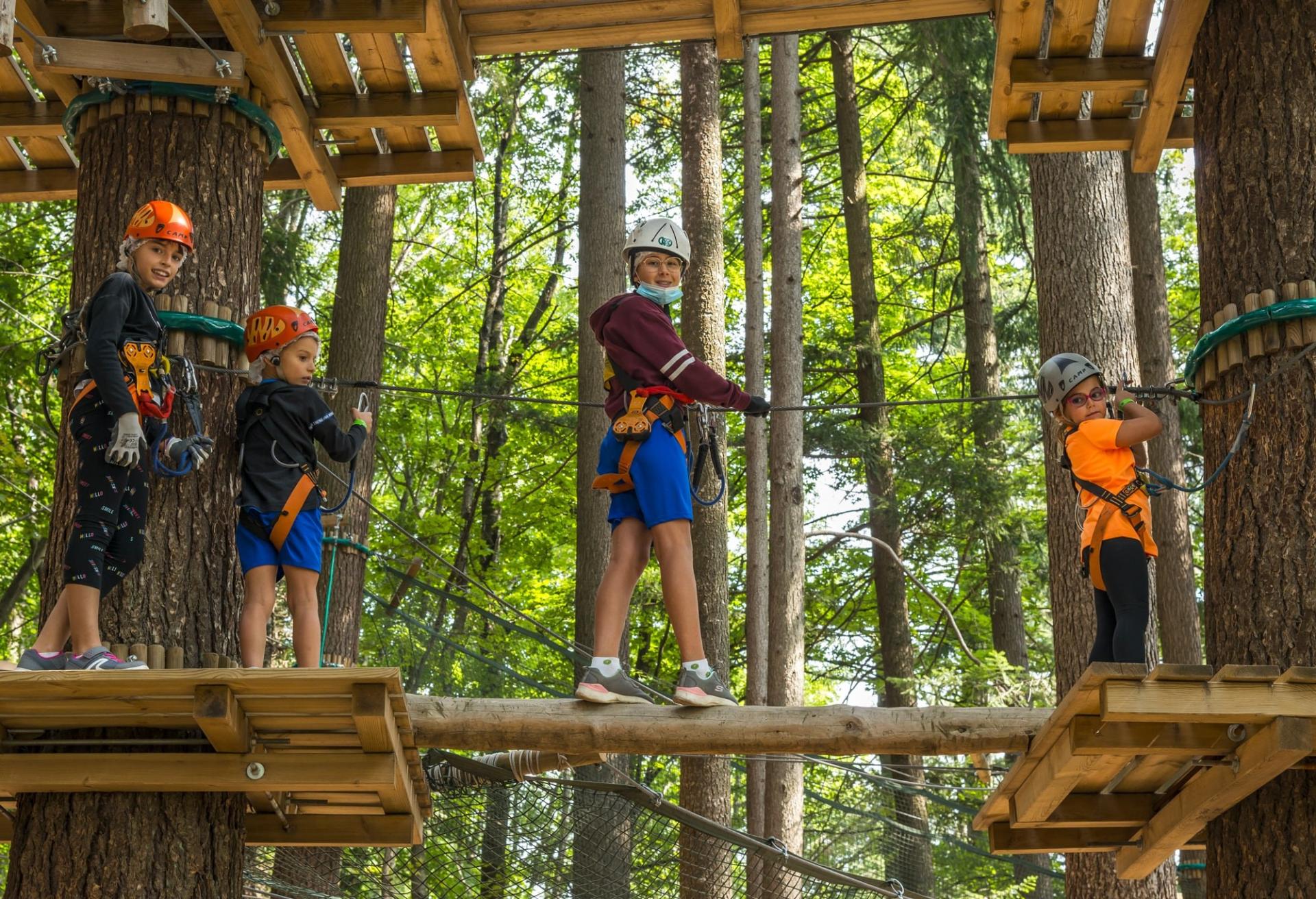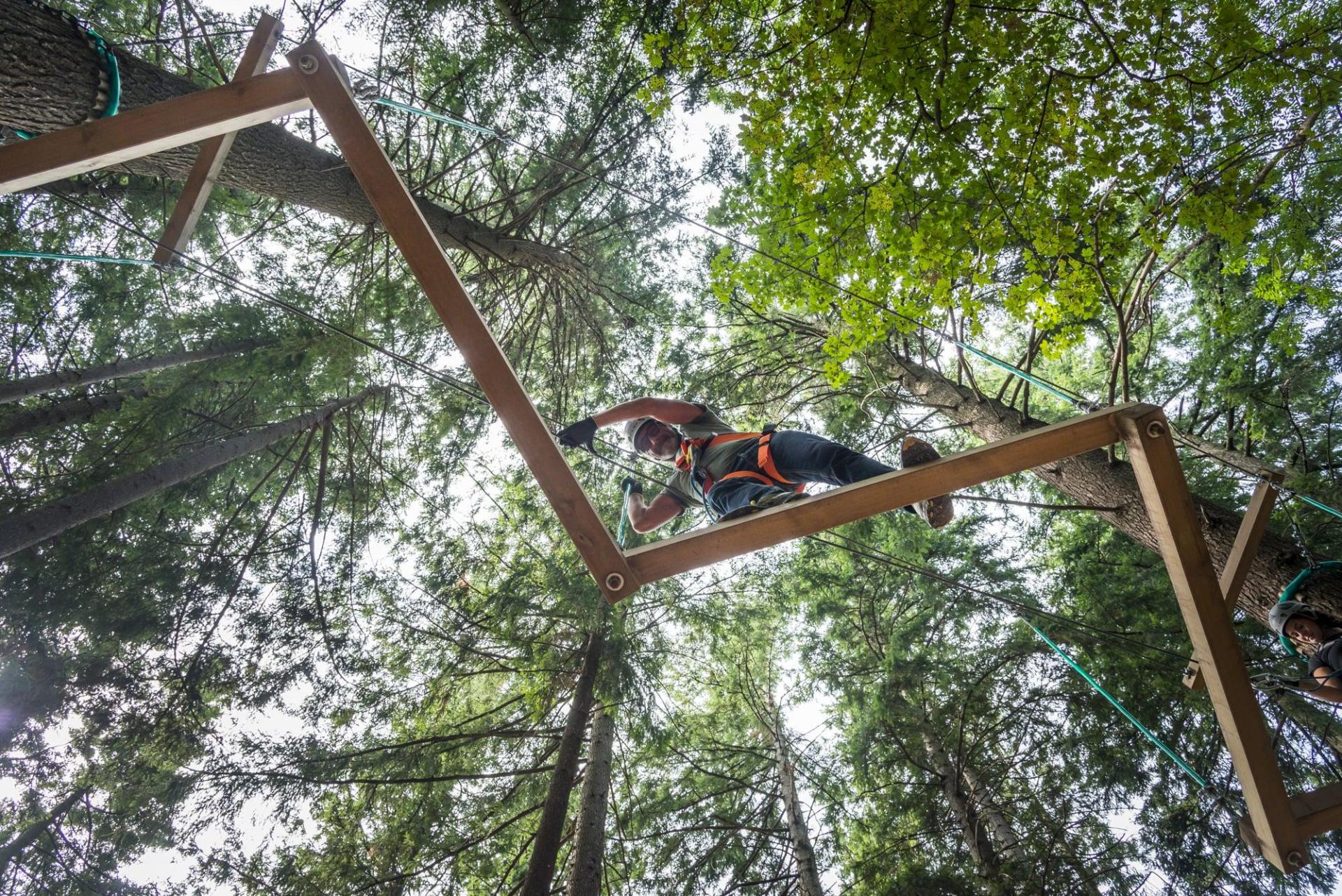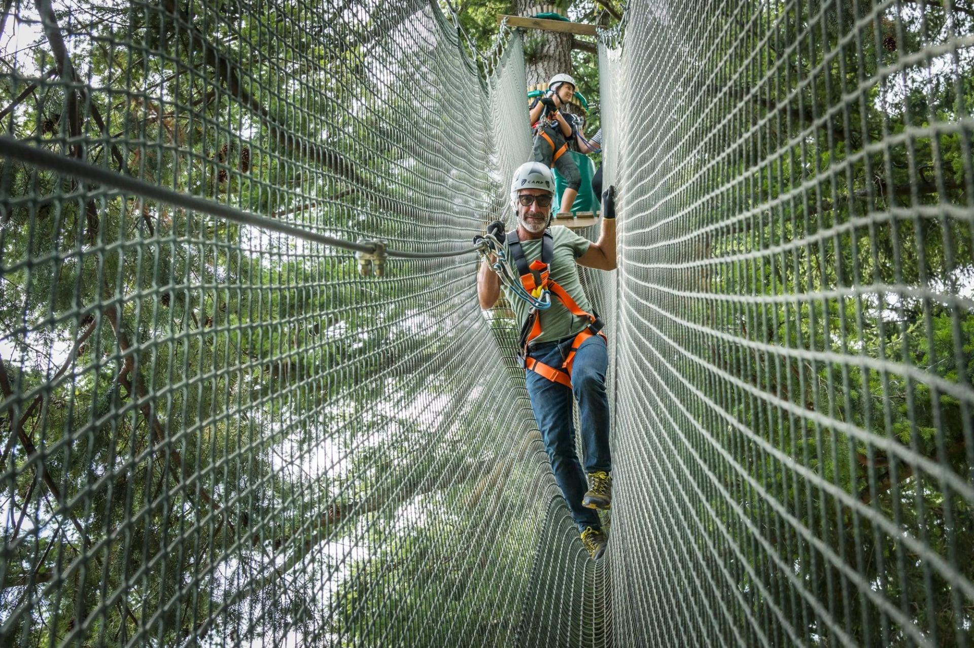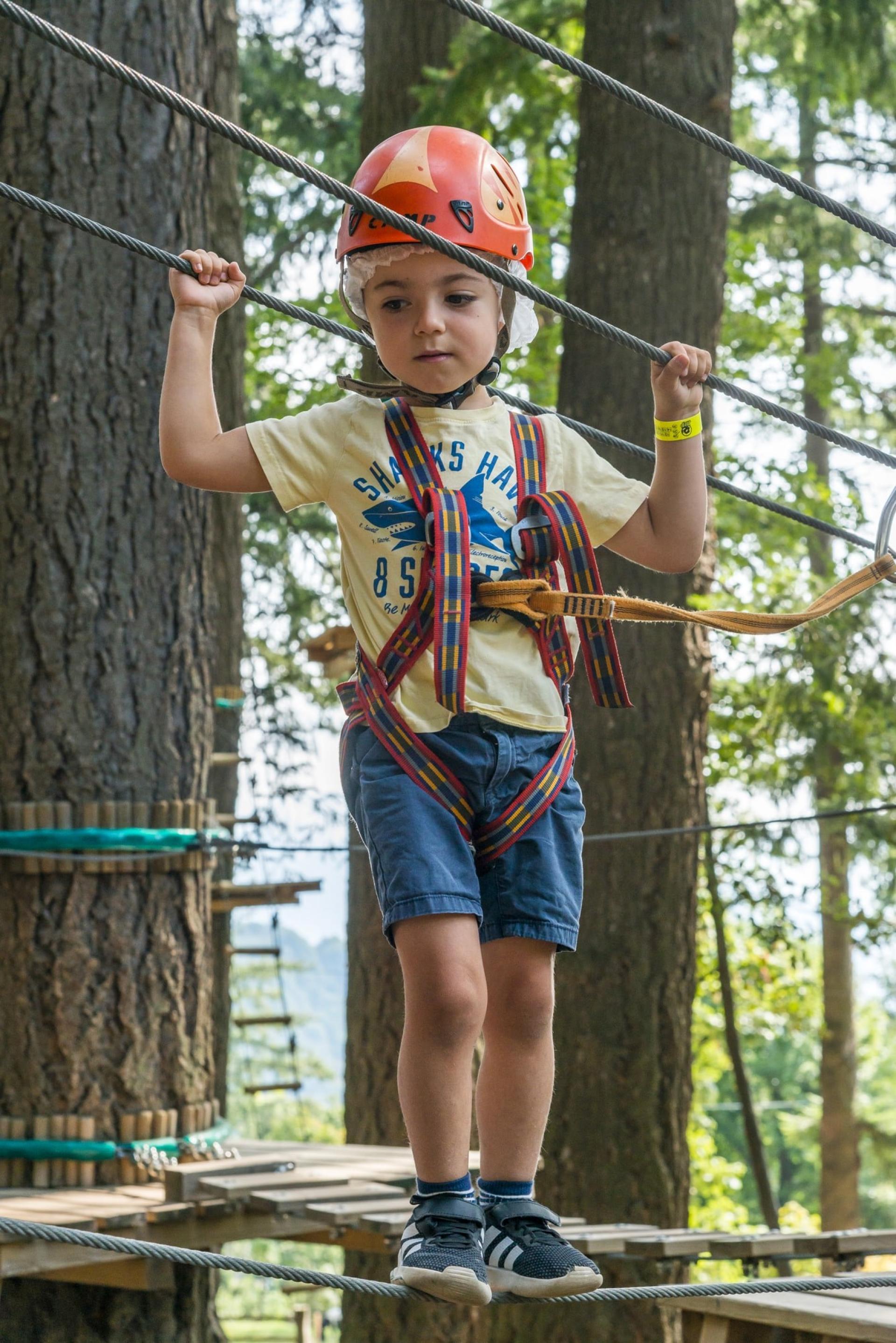 Con i suoi 103 passaggi regala sfide sempre diverse: dall’incredibile Salto di Tarzan, ai passaggi con assi meccaniche, carrucole e scale a chiocciola che si inerpicano su maestosi abeti americani altri fino a 40 metri e dal diametro superiore fino a 2 metri.