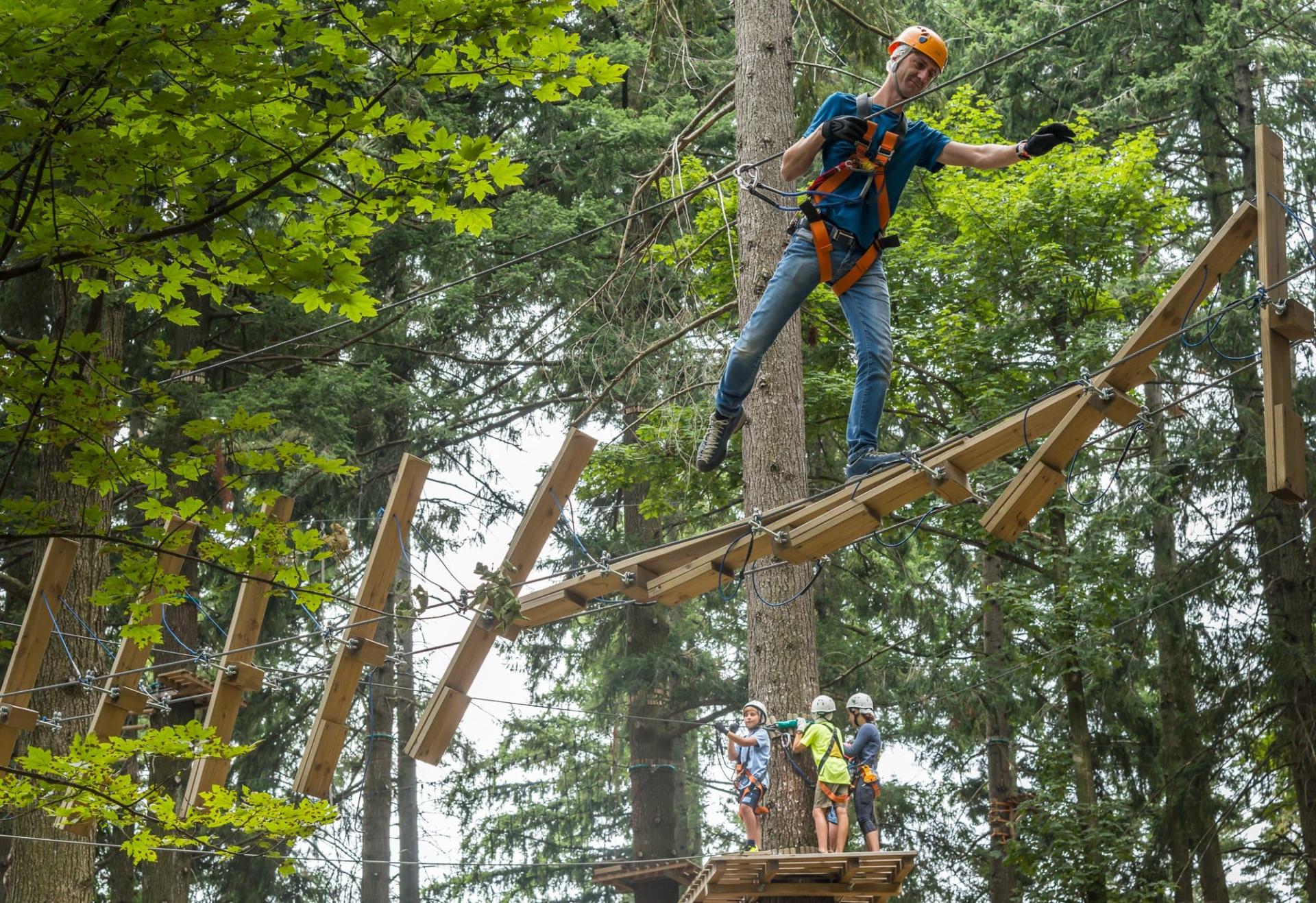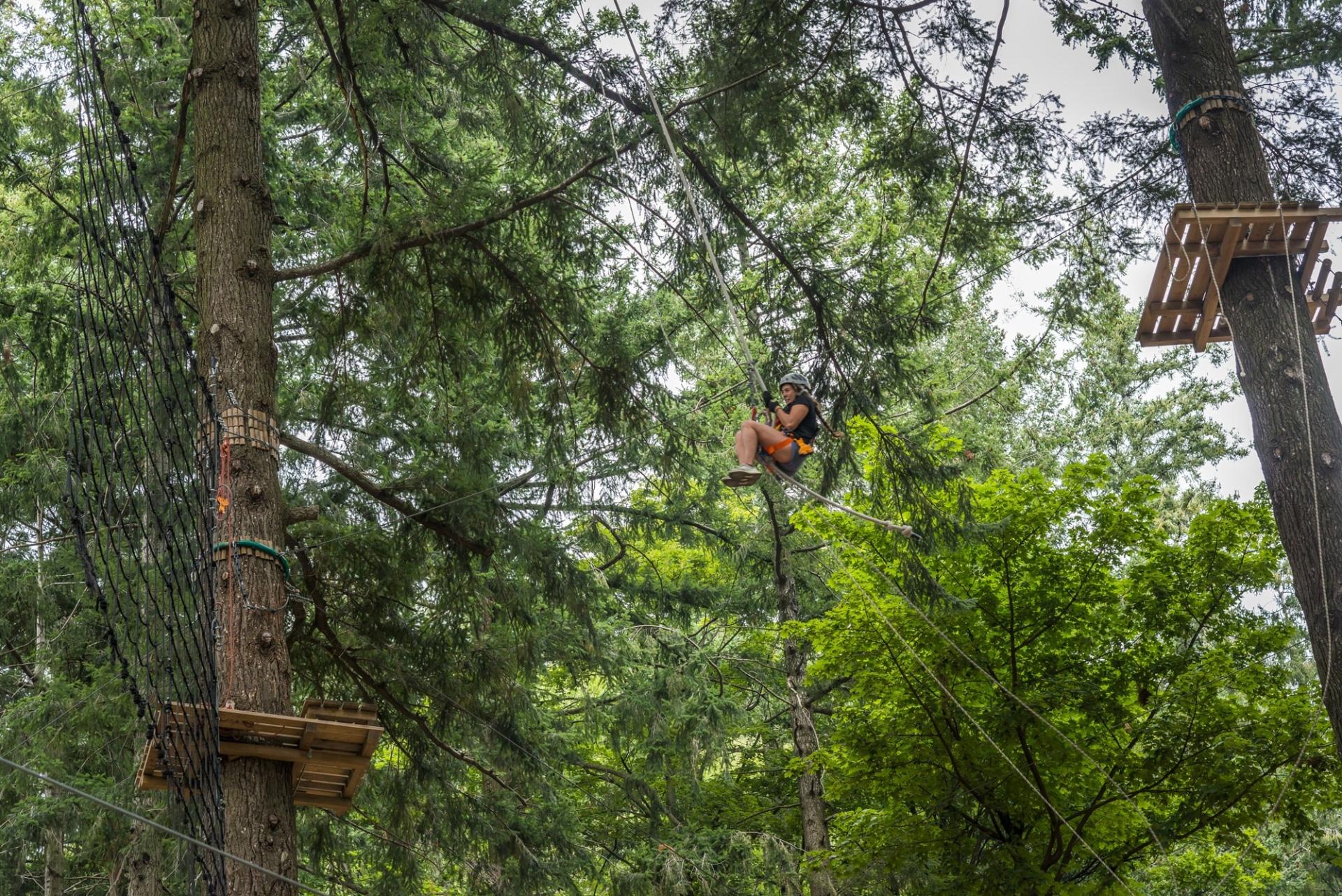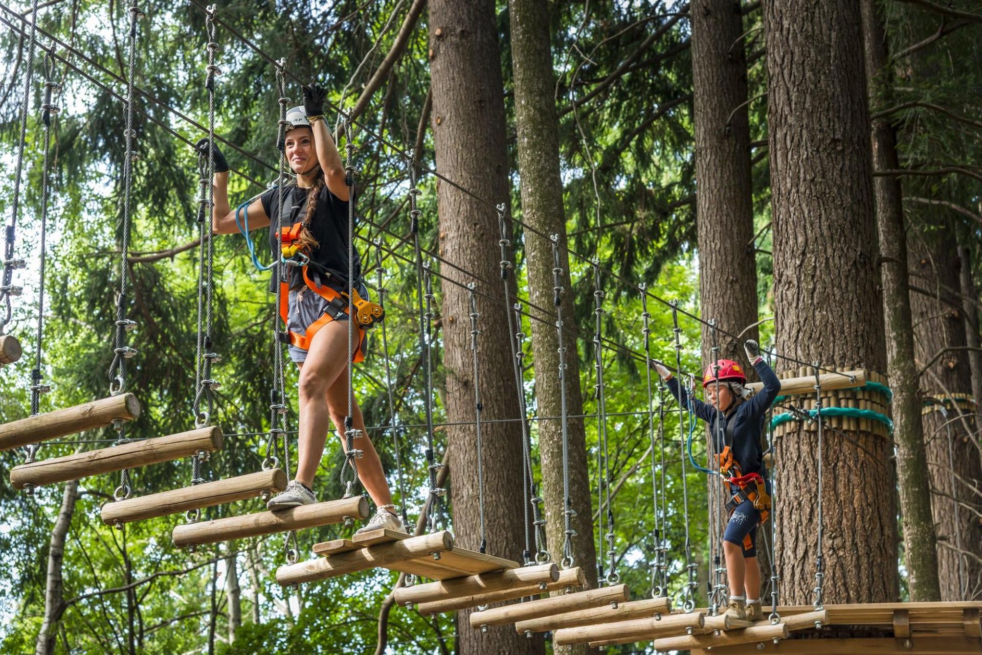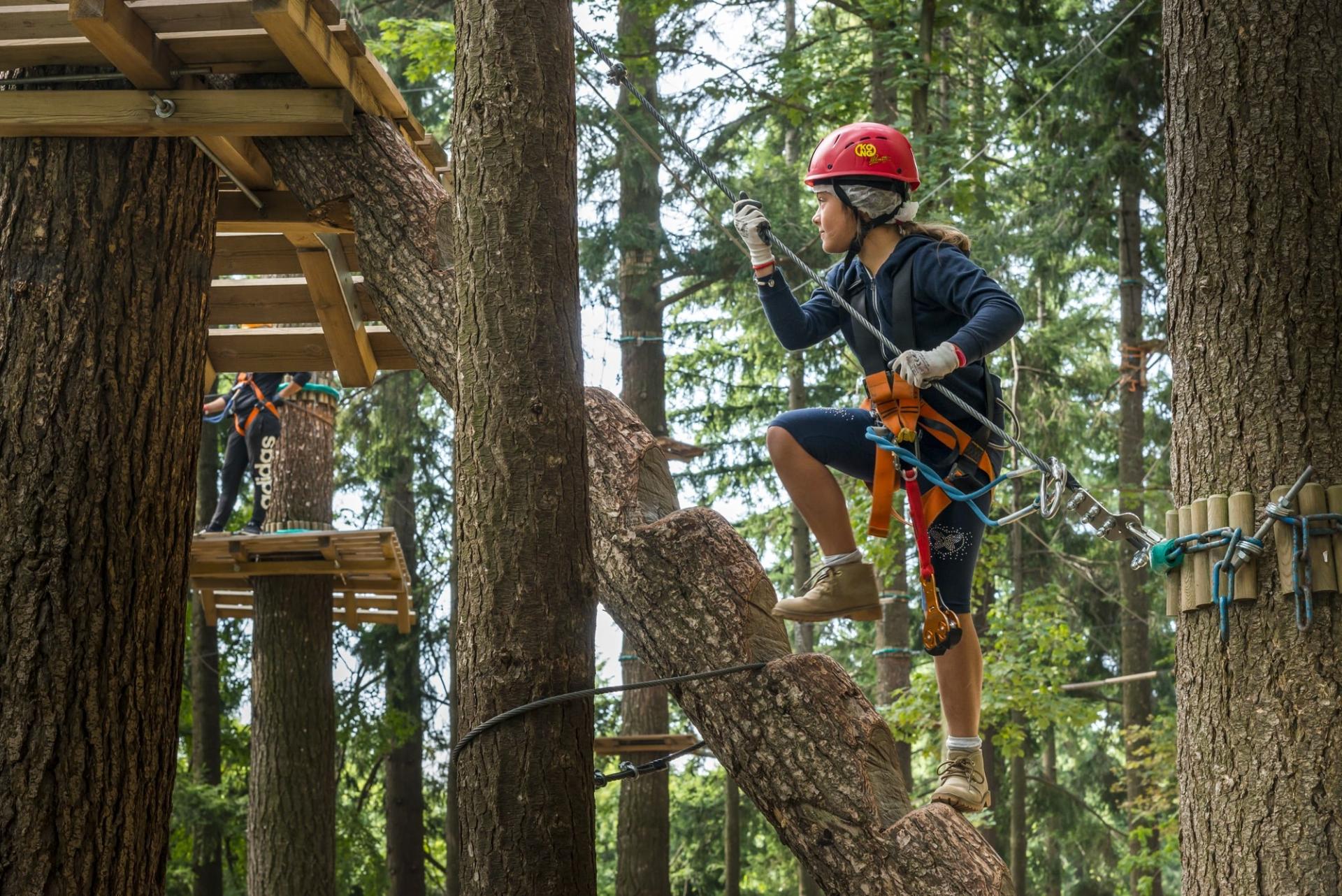 Con i suoi 103 passaggi regala sfide sempre diverse: dall’incredibile Salto di Tarzan, ai passaggi con assi meccaniche, carrucole e scale a chiocciola che si inerpicano su maestosi abeti americani altri fino a 40 metri e dal diametro superiore fino a 2 metri.