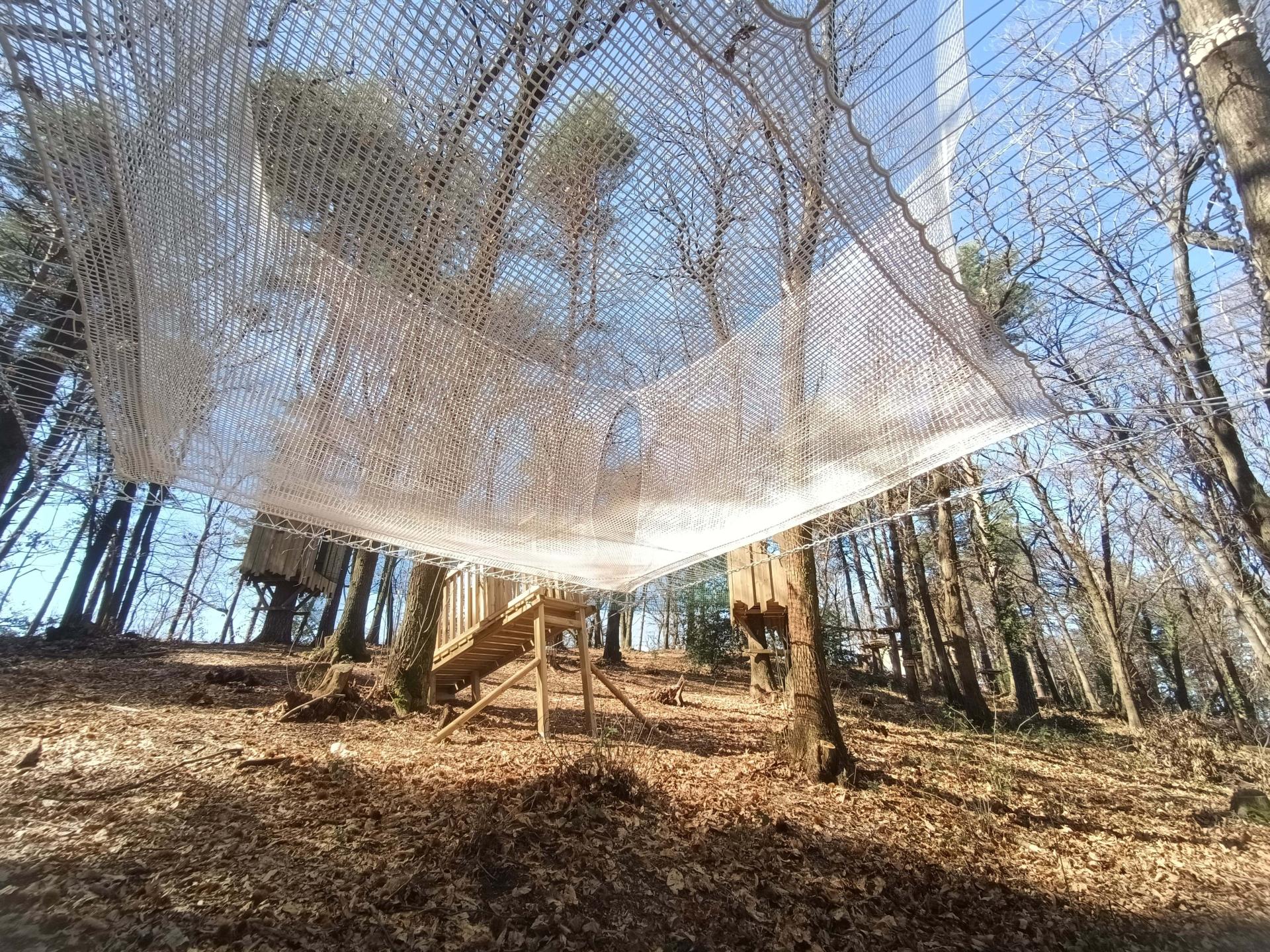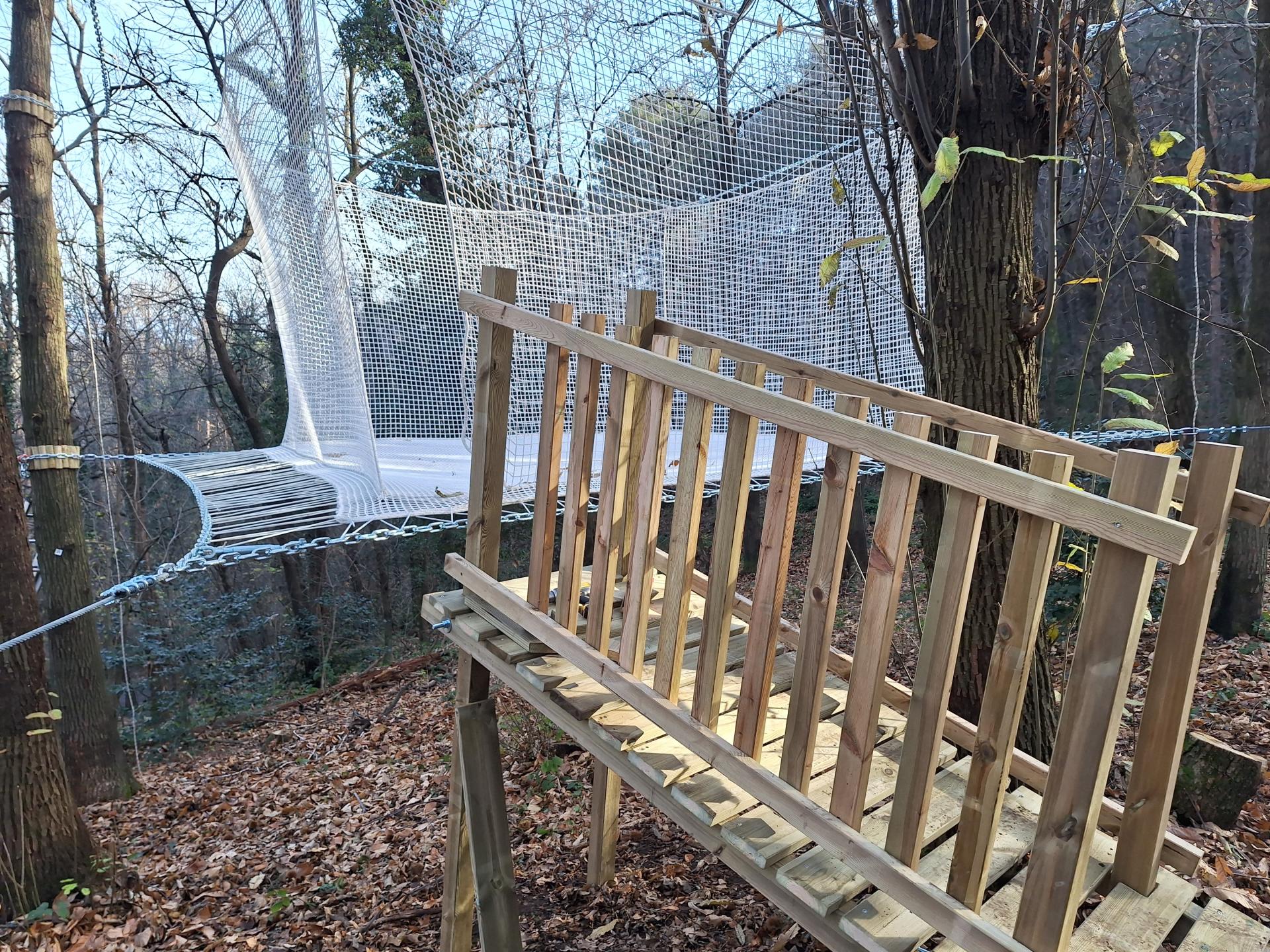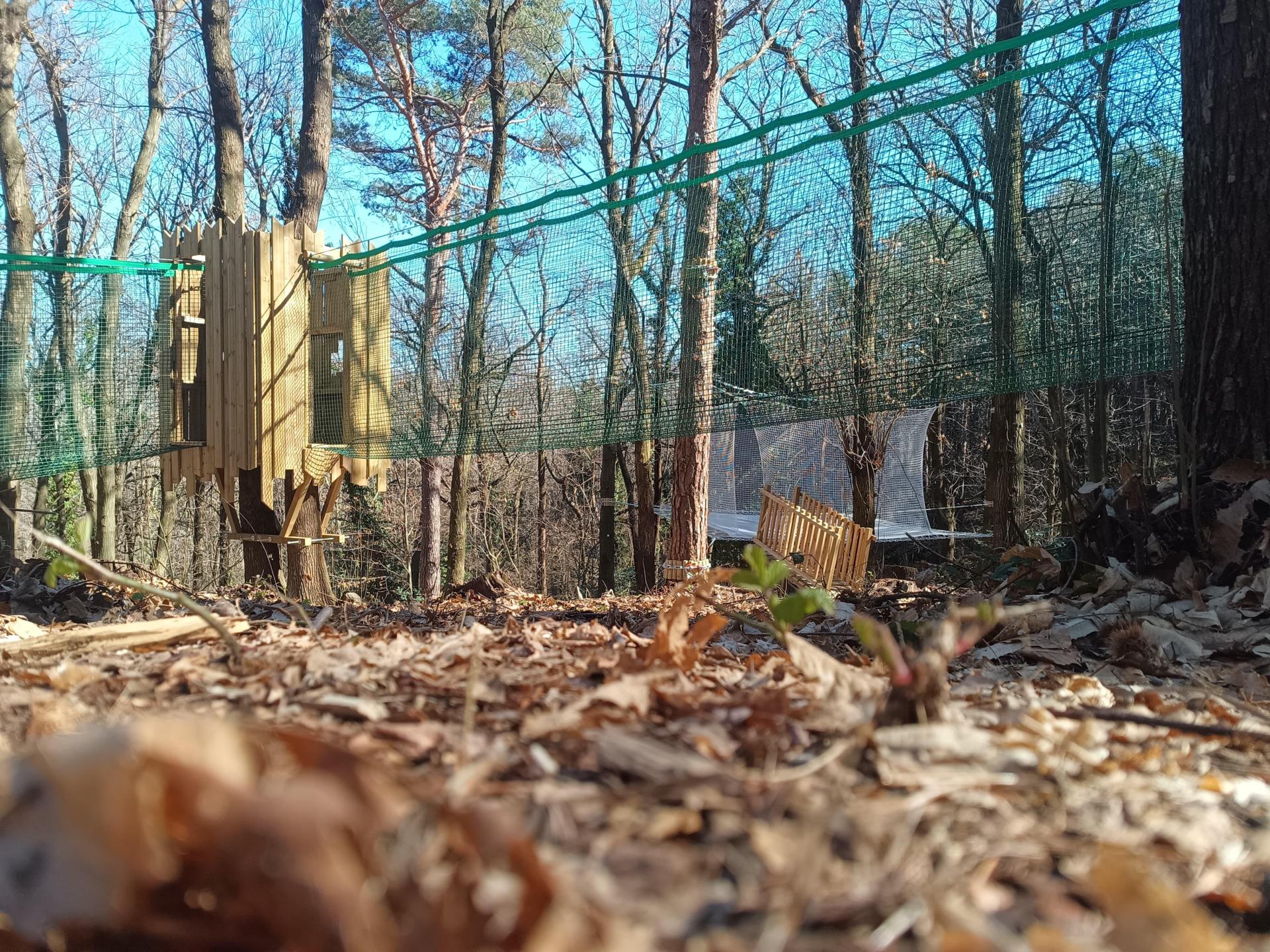 Abbiamo realizzato un parco avventura maggiormente vocato ai bambini costruendo tra l'altro delle casette sugli alberi e un cubo di rete dalle dimensioni molto generose, 5x5 metri, utilizzabili senza imbragatura.