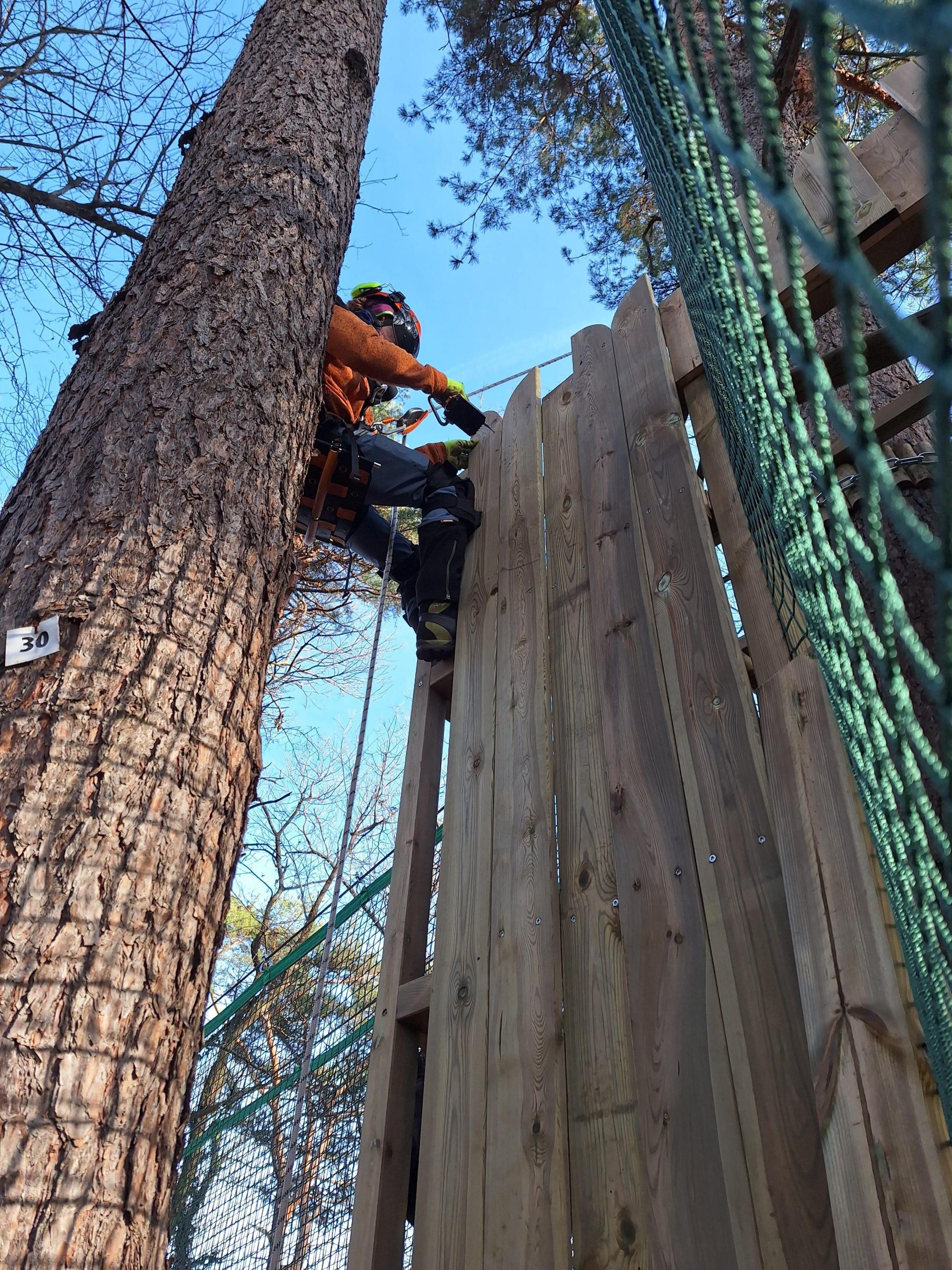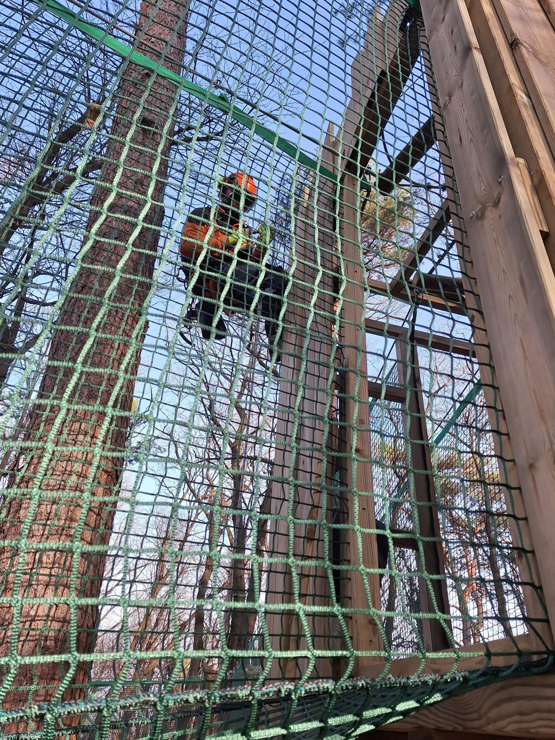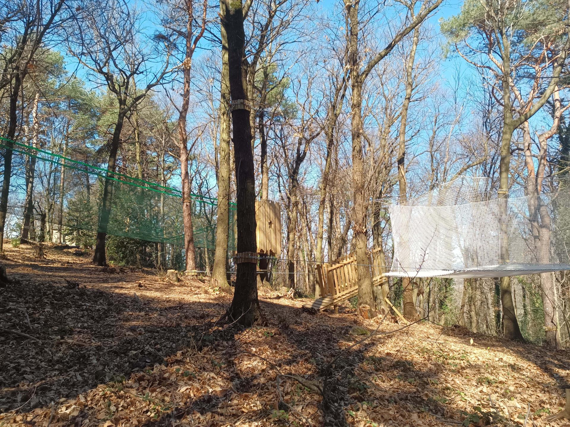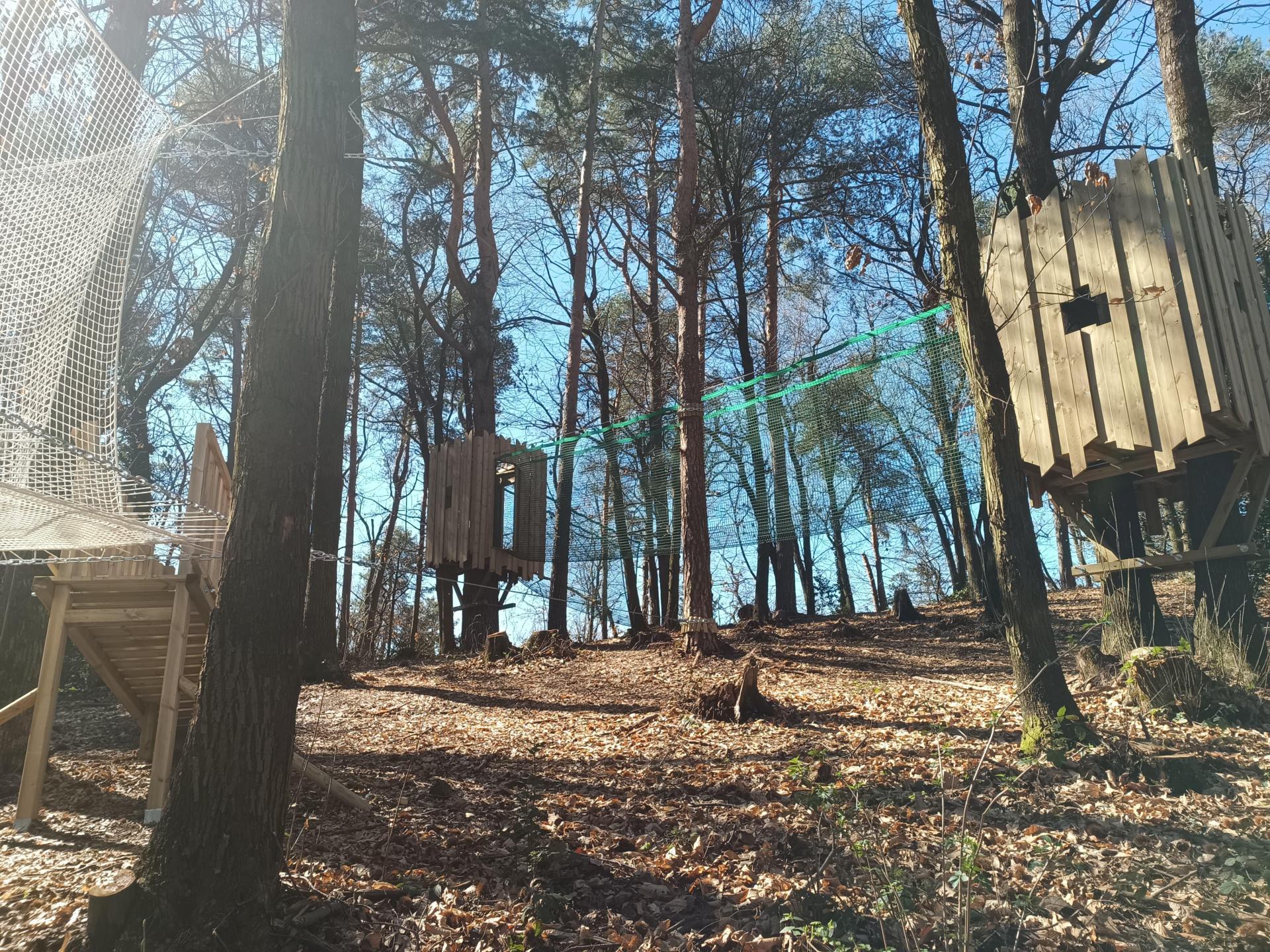 Abbiamo realizzato un parco avventura maggiormente vocato ai bambini costruendo tra l'altro delle casette sugli alberi e un cubo di rete dalle dimensioni molto generose, 5x5 metri, utilizzabili senza imbragatura.