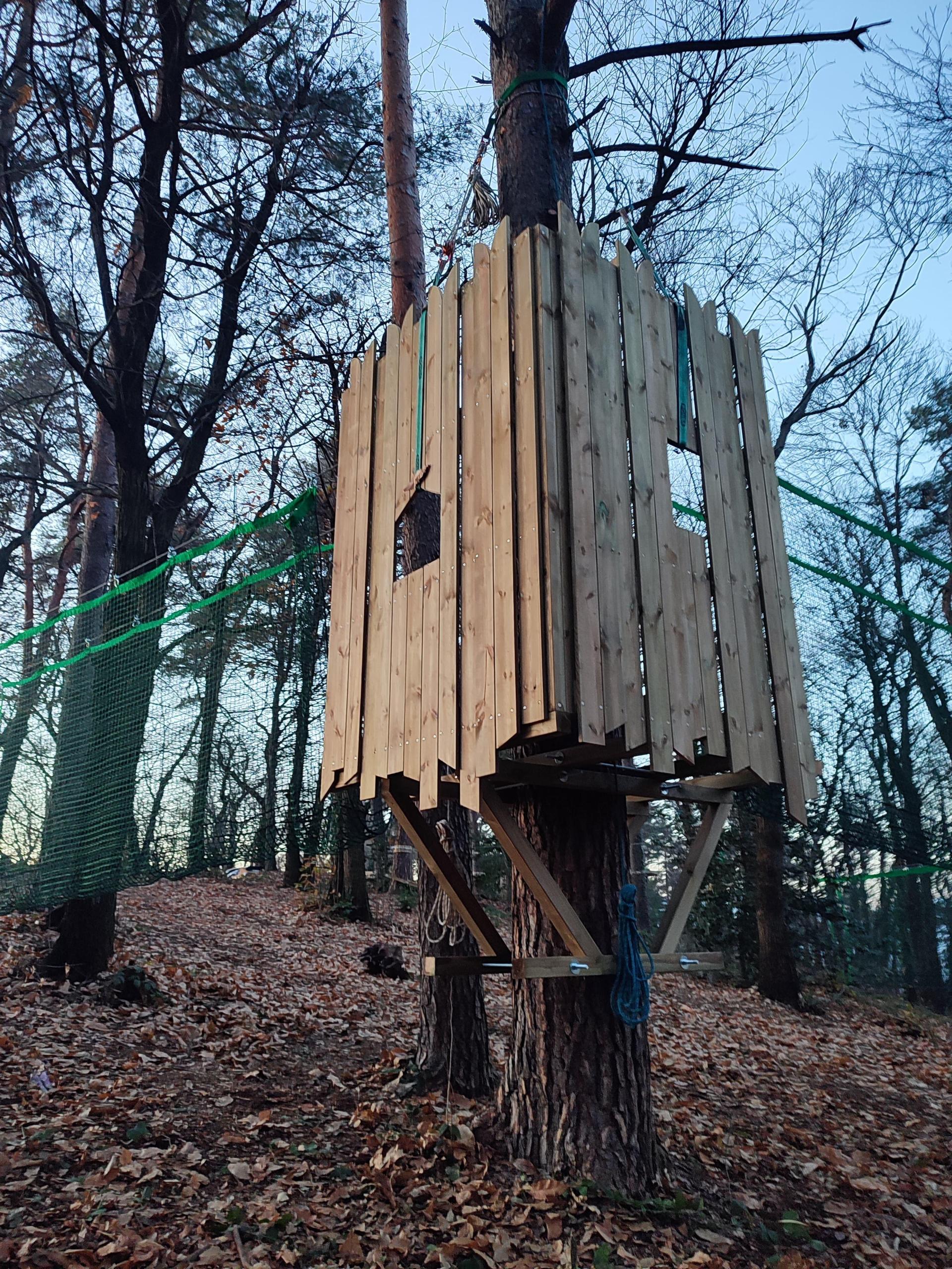 mega cubo di rete e casette sugli alberi.